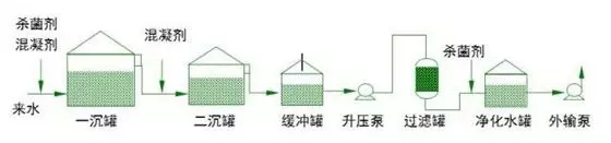 主工艺流程介绍:从脱水站送来的原水投加杀菌剂和混凝剂后,首先进入自然沉降罐(一沉罐)去除浮油,其出水投加混凝剂后,进入混凝沉降罐(二沉罐)进行处理,主要去除乳化油和悬浮固体,再经过缓冲、提升进行压力过滤,得到合格的净化水由外输泵加压后用于回注或深度处理。