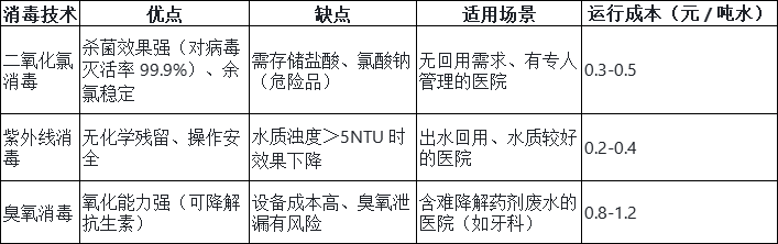 选型建议:多数小型医院优先选 “二氧化氯消毒”(性价比高),若有回用需求或水质较清,选 “紫外线消毒”。