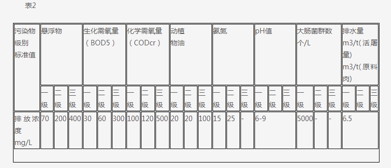 本标准按照不同年限分别规定了肉类加工企业的排水量和水污染物最高允许排放浓度等指标,标准值分别规定为: