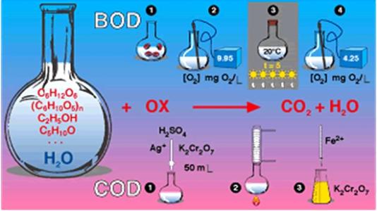 污水中的有机物质不论是在化学氧化过程中还是在生物氧化过程中都要消耗氧,有机物质愈多,则消耗的氧量也愈多,二者之间是呈正比例关系的。于是,将污水用化学药剂氧化所消耗的氧量称为COD(化学需氧量),将污水中微生物氧化所消耗的氧量称为BOD(生气需氧量)。