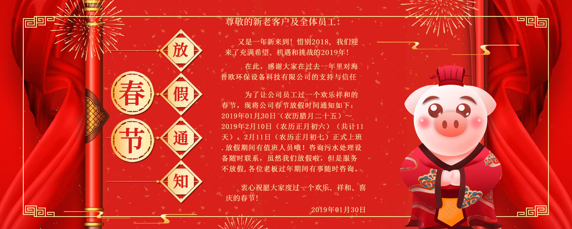 尊敬的客户朋友们: 一年一度的新春来到了!告别了2018,我们一起迎来了充满希望、机遇和挑战的2019年!感谢新老客户及朋友们一直以来对我司的大力支持与帮助,在…