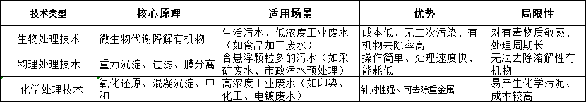 不同类型的污水(生活污水、工业废水、农业污水)水质差异大,需匹配针对性技术。以下为三类主流技术的适用场景与优势对比: