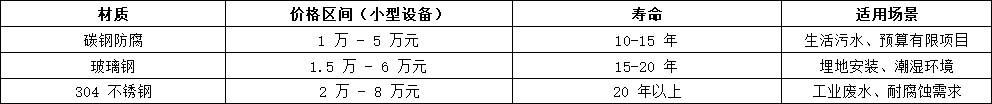 ◦生活污水类(A/O 工艺 + 一级 A 标准):8 万 - 30 万元(30 吨 / 日小区设备约 22 万元)